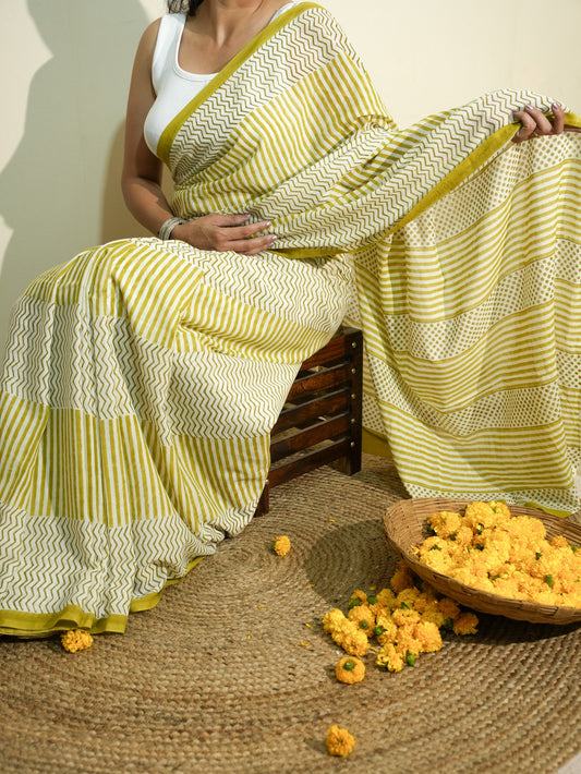 GREESHA_Heritage Hand Block Printed Pure Cotton Striped Saree