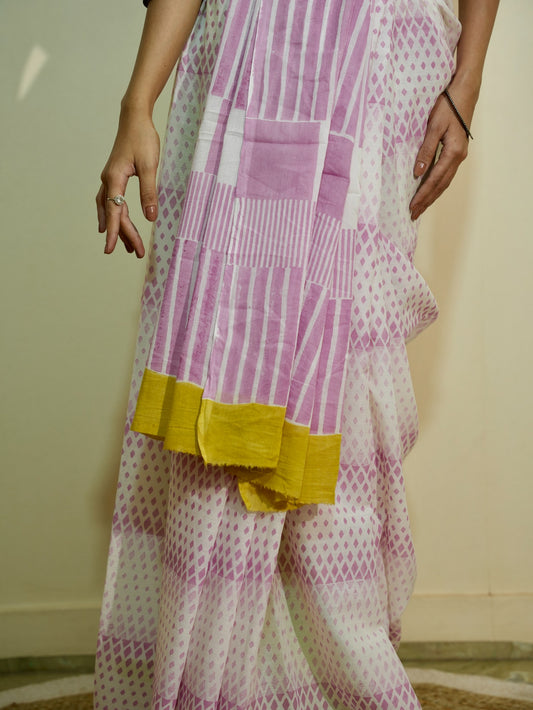 PIHU_Heritage Hand Block Printed Pure Cotton Striped Saree