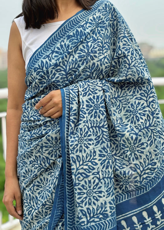 Each saree is hand block printed using dabu mud resist and then dyed in natural indigo, creating layered blue tones that range from deep midnight to soft washed neela. The resist patterns emerge in contrast against the indigo base, highlighting the texture of handcrafted printing.