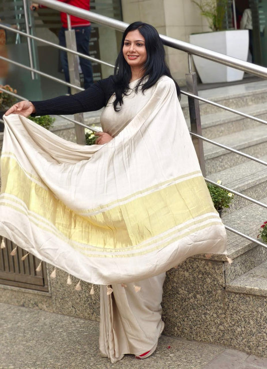 Off White Colour Modal Plain Saree With Tissue Pallu