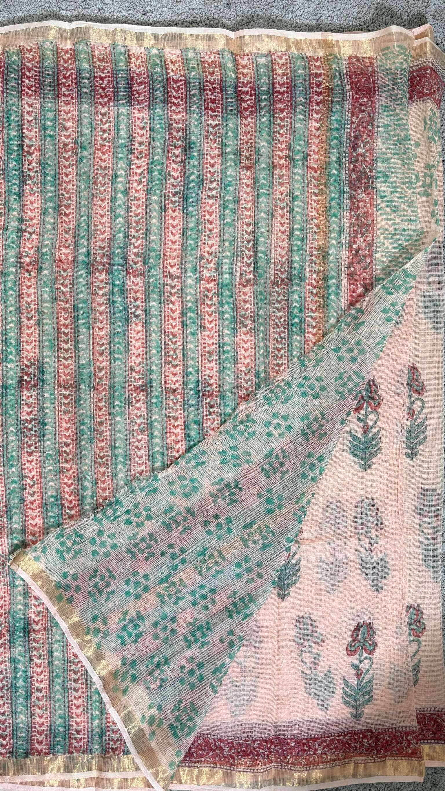 It is a stunning hand block print saree in kota doria which is a perfect blend of traditional and contemporary style. A perfect staple for work wear that brings out the diva in you and keeps you comfortable all day long.