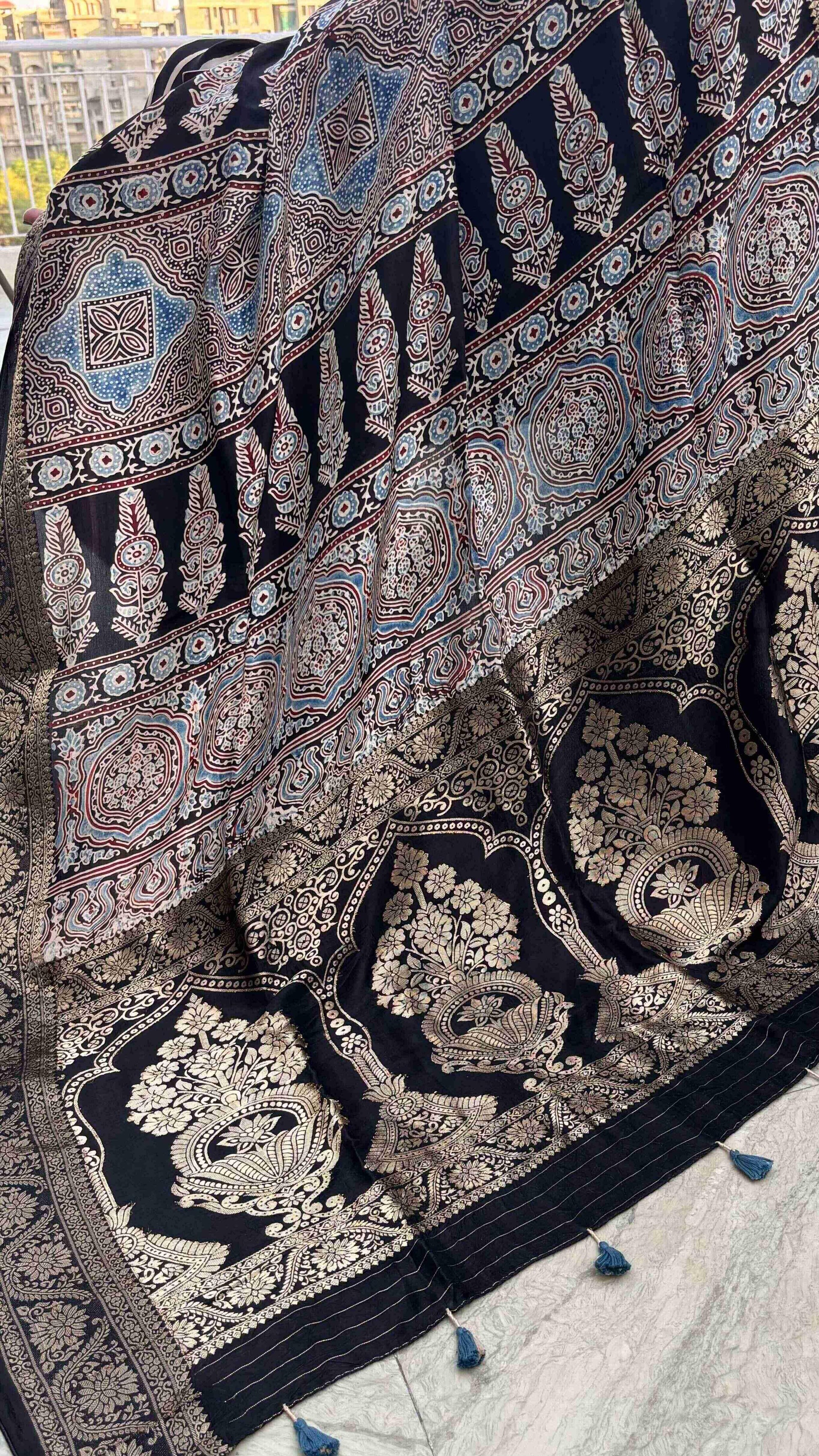 Black - Ajrakh Handblock Dola Silk Saree