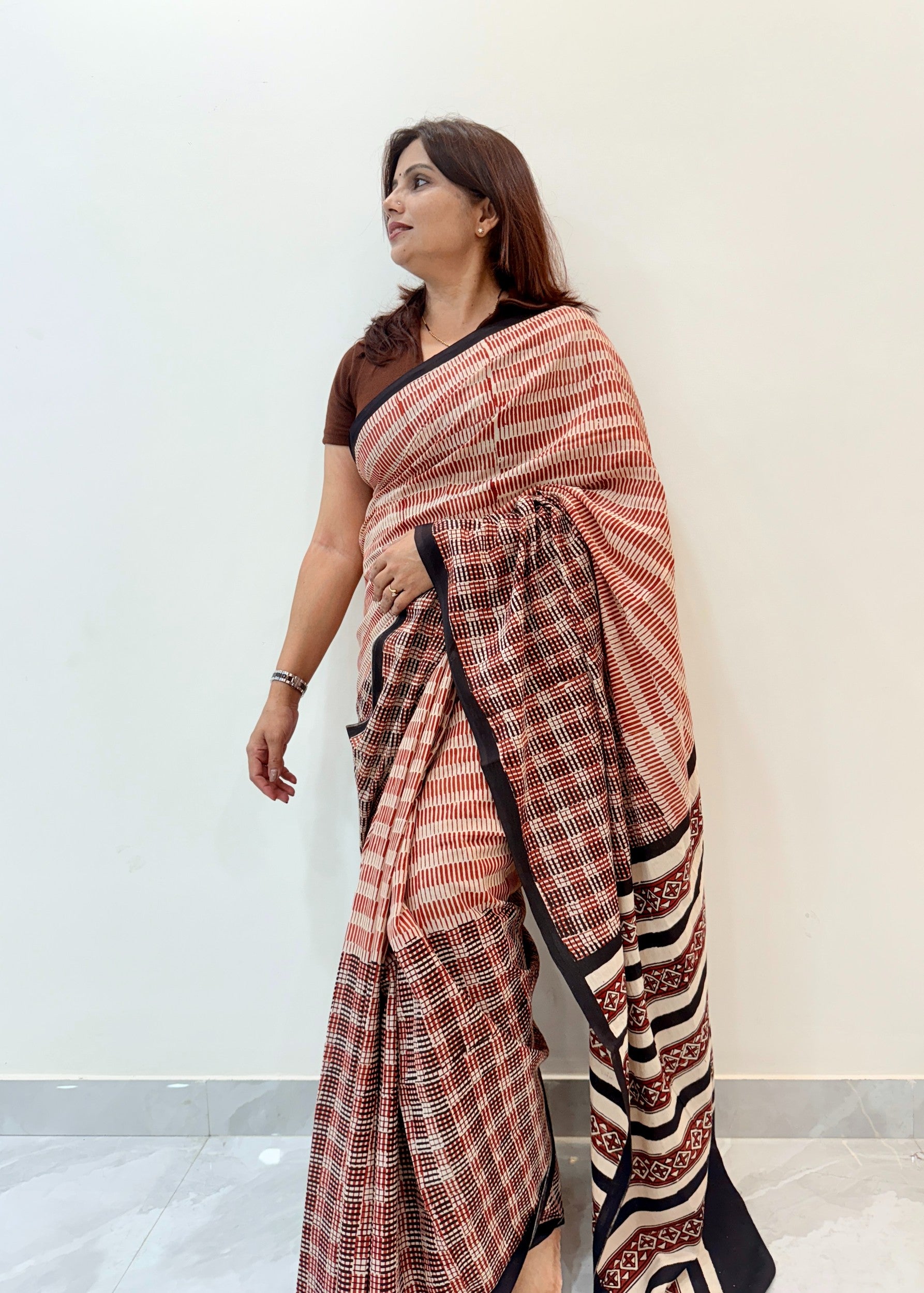 This Bagru printed saree is naturally dyed and adorned with vertical and horizontal stripes — a true celebration of heritage and craftsmanship.